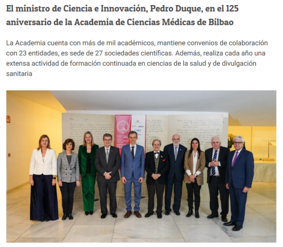 2020-01-20 elmedicointeractivo_com. El ministro de Ciencia e Innovación, Pedro Duque, en el 125 aniversario de la Academia de Ciencias Médicas de Bilbao