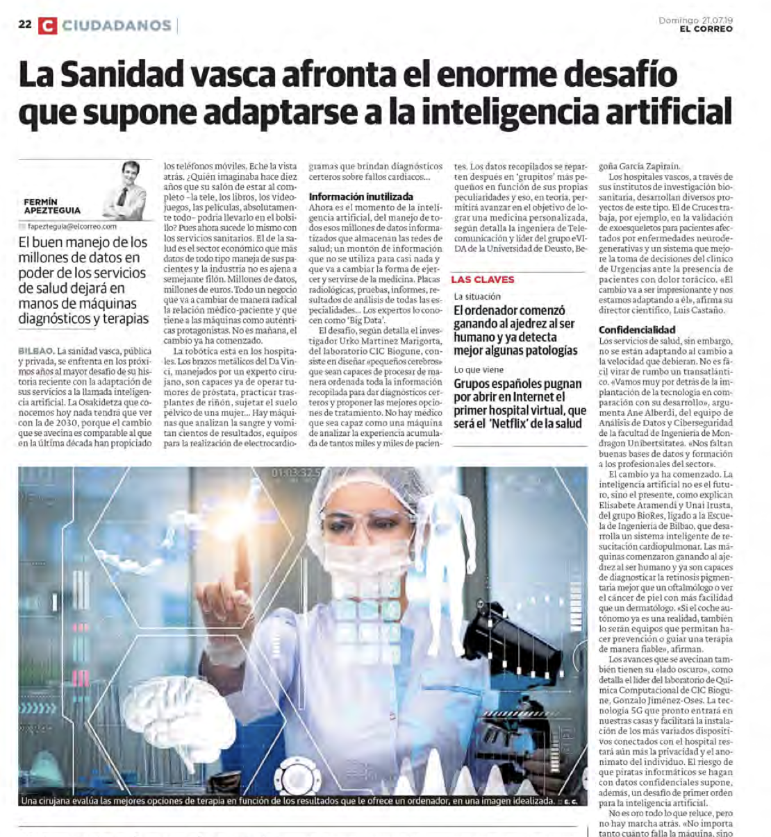 El Correo. Sanidad vasca afronta el enorme desafío que supone adaptarse a la inteligencia artificial + Opinión. Hipócrates 2.0