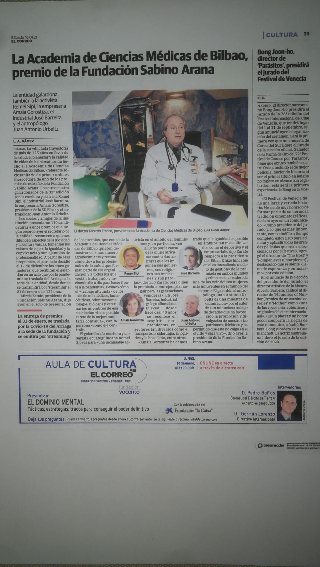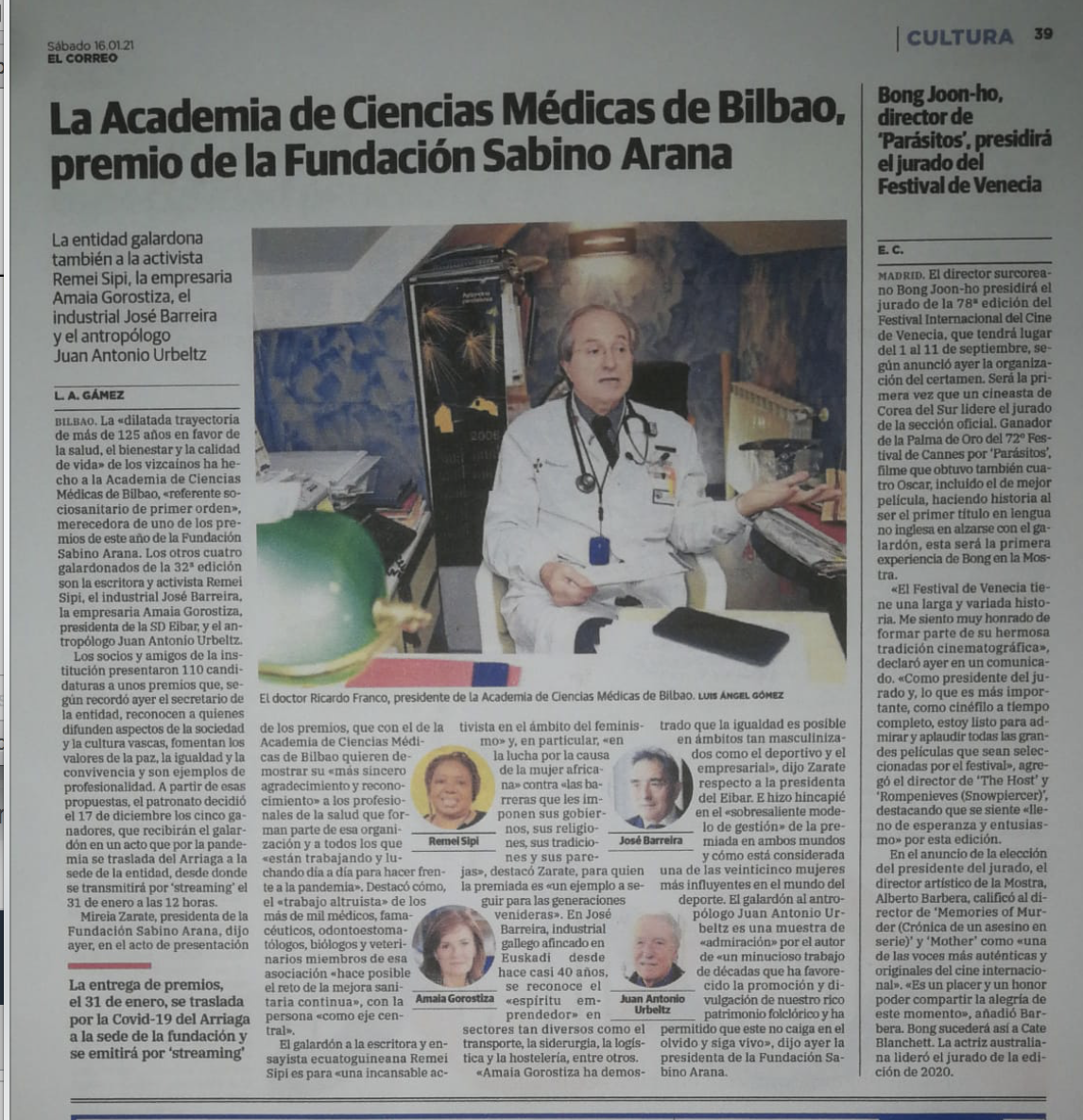 2021-01-16 El Correo. Academia de Ciencias Médicas de Bilbao. Premio de la Fundación Sabino Arana