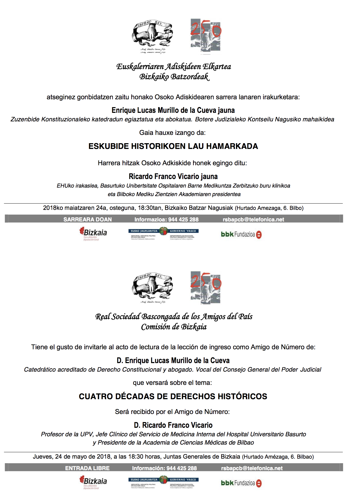 La liturgia del ingreso en la R.S.B.A.P, exige una contestación acorde con la categoría del discurso del amigo/a entrante , lo cual no va a ser tarea fácil en mi caso, dada la profundidad doctrinal y analítica con la que nuestro nuevo amigo de número, el Prof. Enrique Murillo de la Cueva ha abordado LAS CUATRO DECADAS DE DERECHOS HISTORICOS desde su condición de constitucionalista de cuna. Y digo ésto habida cuenta del magnífico genoma transmitido por vía paterna.