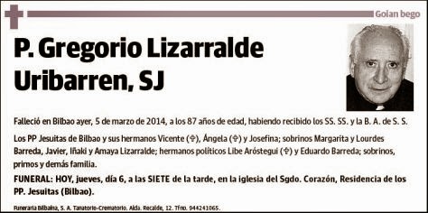 El Dr. Fran García Llorente, actor destacado del grupo y miembro de Hospitalidad de Lourdes, la Asociación que le rindió un sentido homenaje el pasado mes de Junio 2013 en el Auditorium de la Alhóndiga, nos mandaba el siguiente correo a las 12:46 h. : Me acaban de comunicar que el Padre Lizarralde ya no va actuar con nosotros en persona y que lo hará en espíritu, Goian bego (descanse en paz).